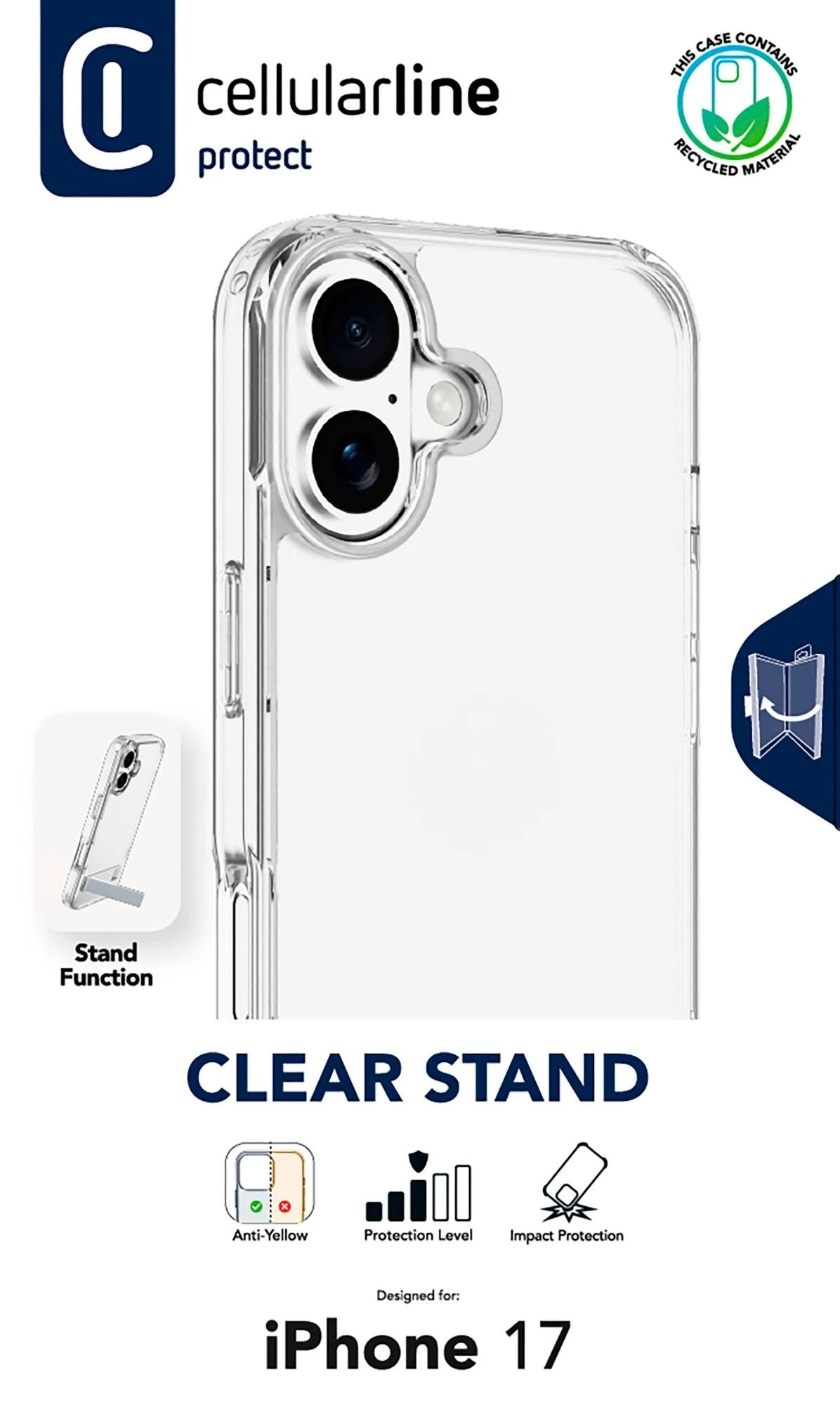 Clear Stand ist die transparente Schutzhülle mit integriertem Standfuß – ideal für freihändiges Telefonieren, Streaming oder Arbeiten. Sie besteht aus einem harten Rücken und stoßdämpfendem Gummirahmen und schützt zuverlässig vor Stößen und Stürzen. Erhöhte Kanten schützen Bildschirm und Kamera. Die antibakterielle Oberfläche und das Anti-Vergilbungs-Material sorgen für dauerhafte Hygiene und Klarheit.